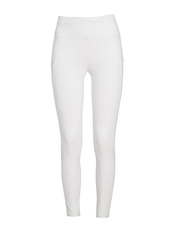White riding leggings with light compression. Full grip with W-logo silicon print is comfortable in use. Thigh pockets on both sides.